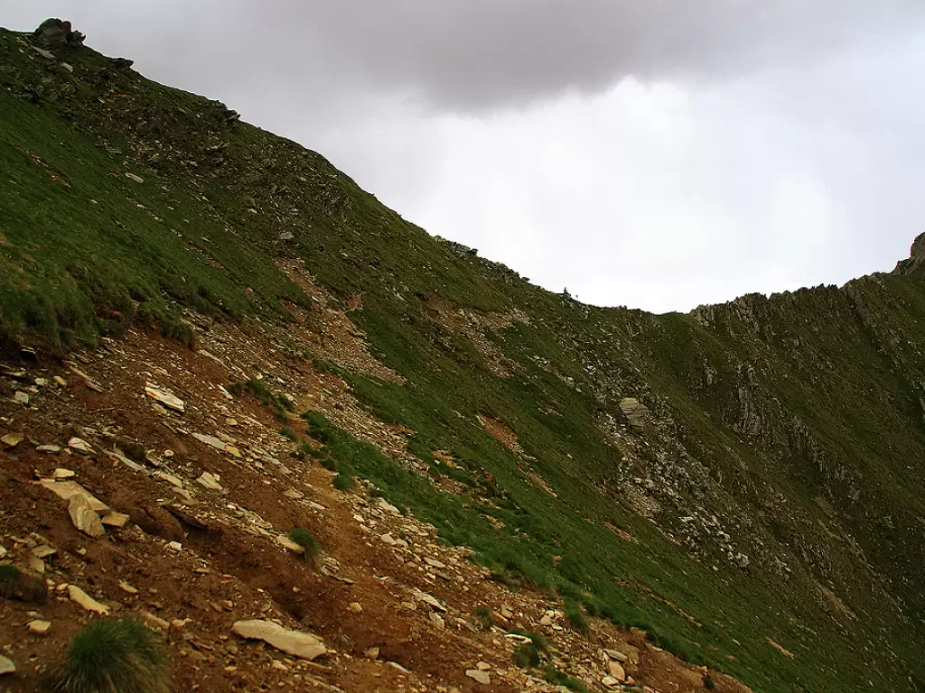 Une grande dépression herbeuse située sur la crête qui descend des Corni Bruciati au Monte Caldenno relie le Val Postalesio...